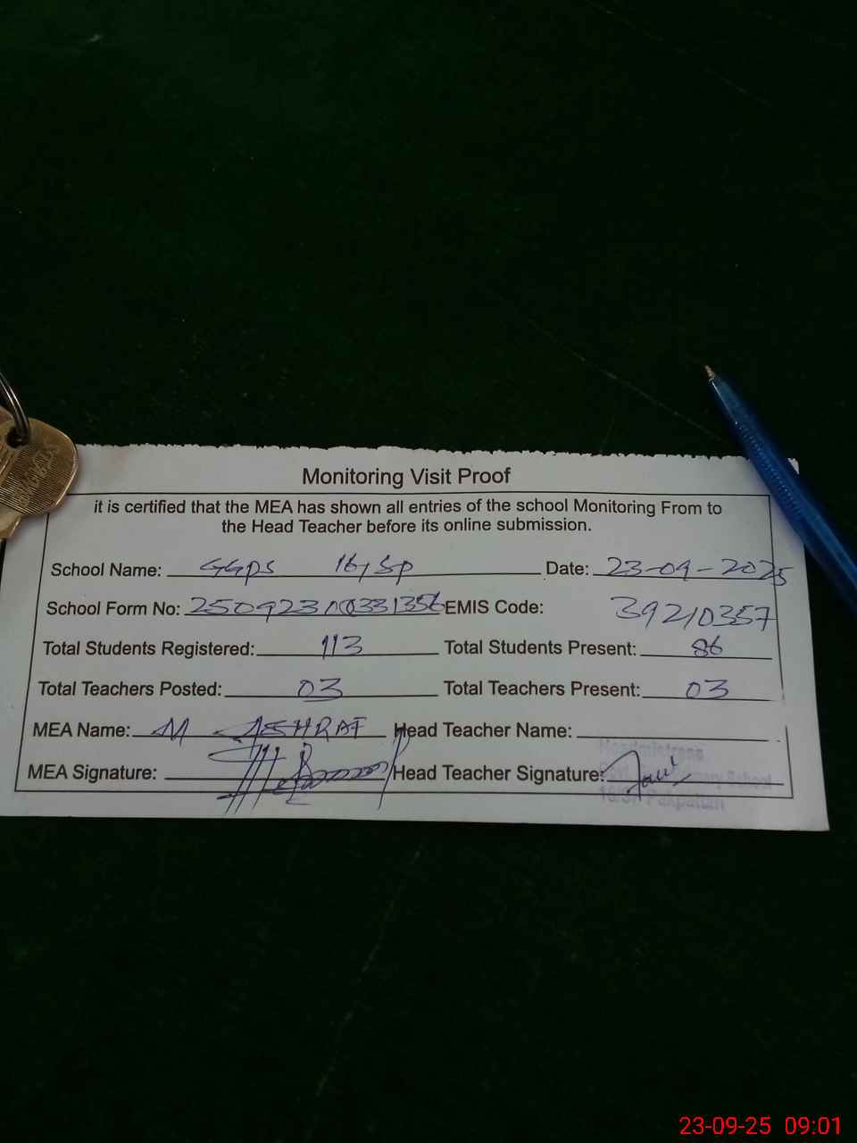 | Attendance Register | Head Teacher | MEA with School | Visit Proof |