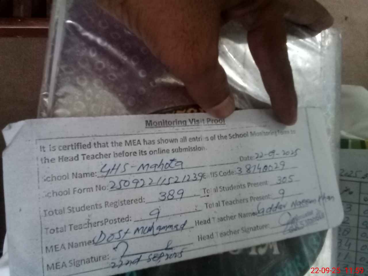 | Attendance Register | Head Teacher | MEA with School | Visit Proof |