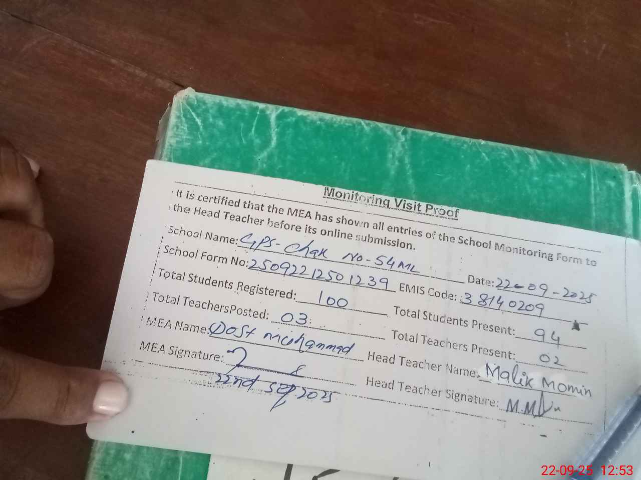 | Attendance Register | Head Teacher | MEA with School | Visit Proof |