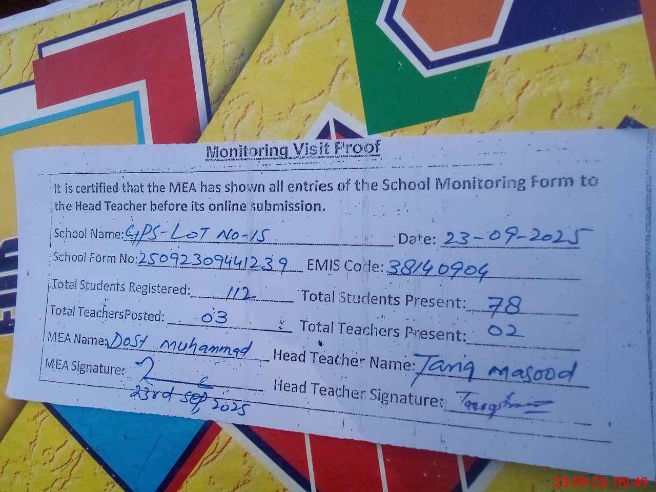 | EMIS Code: 38140904 | Name of School: GPS LOT NO.15 | |||