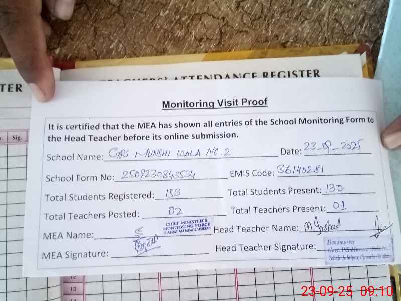 | Attendance Register | Head Teacher | MEA with School | Visit Proof |