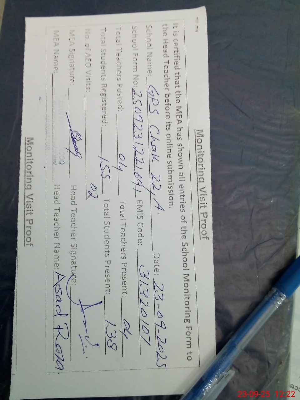 | EMIS Code: 31320107 | Name of School: GPS CHAK 22 A | |||
