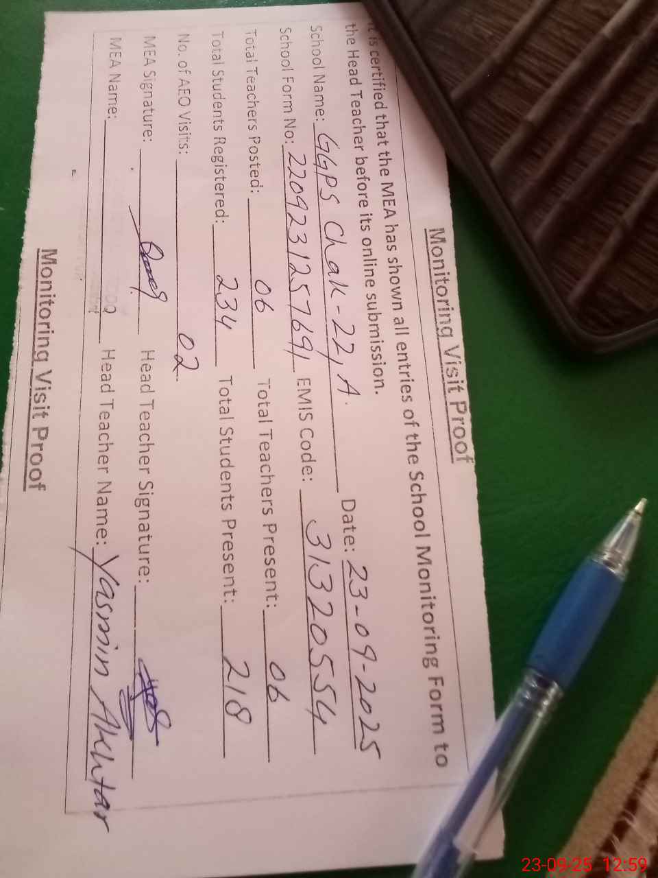 | EMIS Code: 31320554 | Name of School: GGPS CHAK NO 22/A | |||