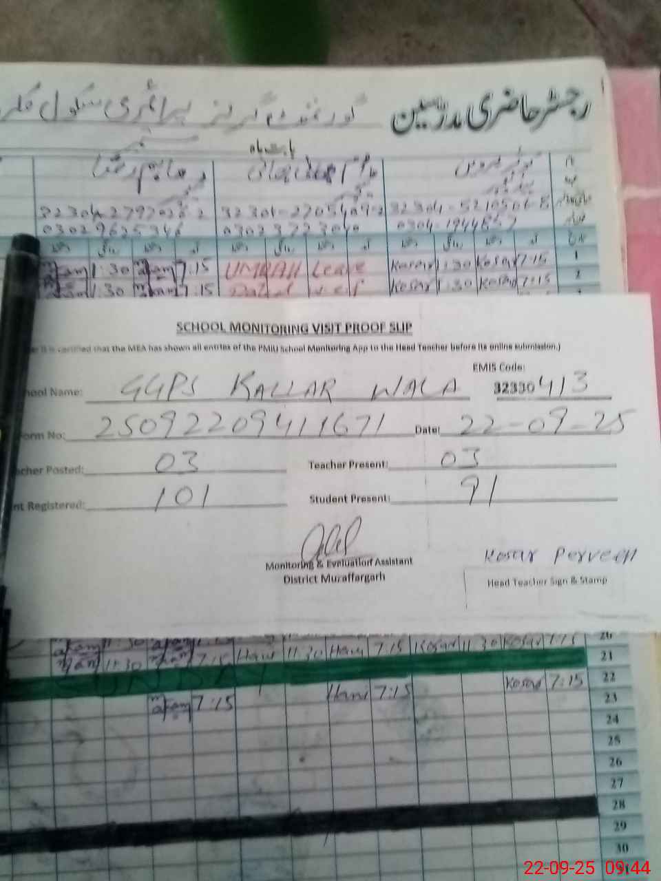 | Attendance Register | Head Teacher | MEA with School | Visit Proof |