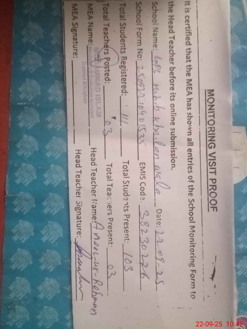 | Attendance Register | Head Teacher | MEA with School | Visit Proof |