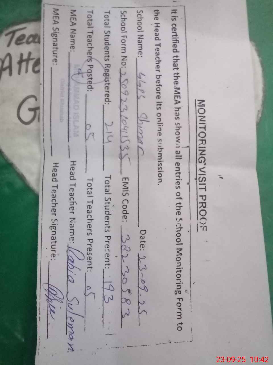 | Attendance Register | Head Teacher | MEA with School | Visit Proof |