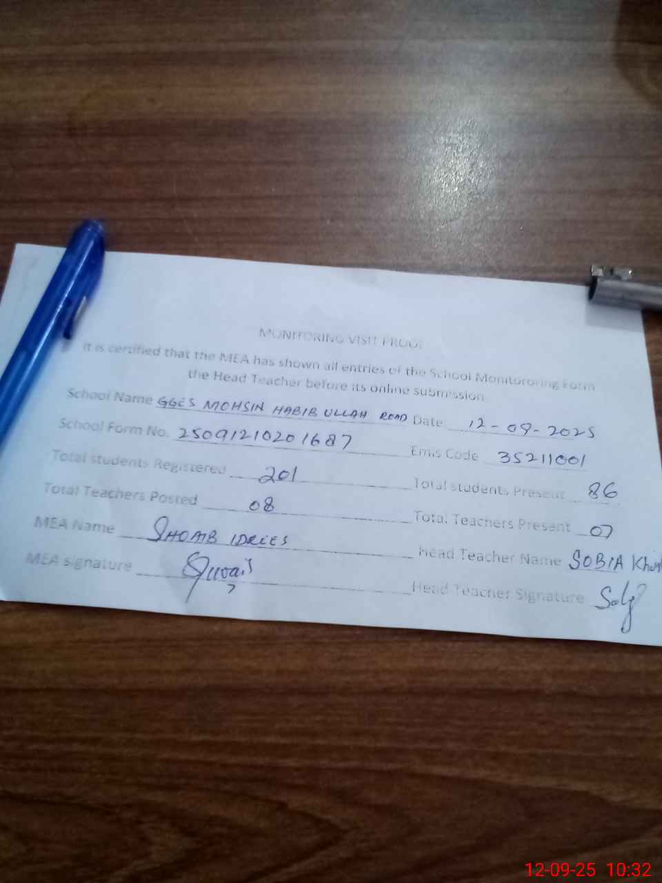 | Attendance Register | Head Teacher | MEA with School | Visit Proof |