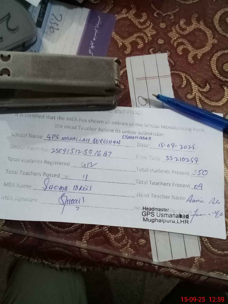 | EMIS Code: 35210259 | Name of School: GPS MOHALLAH QURESHAN USMAN ABAD | |||