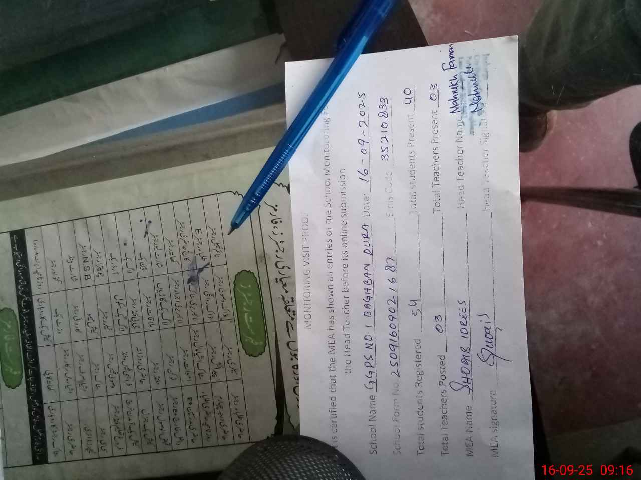 | Attendance Register | Head Teacher | MEA with School | Visit Proof |