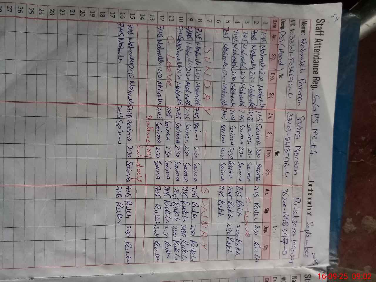 | CNIC | Full Name | Designation | R/C | Absence during last cal. month |