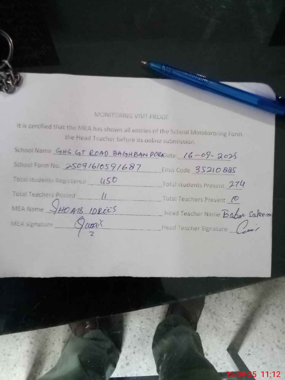 | EMIS Code: 35210885 | Name of School: GHS G.T. ROAD BAGHBAN PURA (EX-MCL) | |||