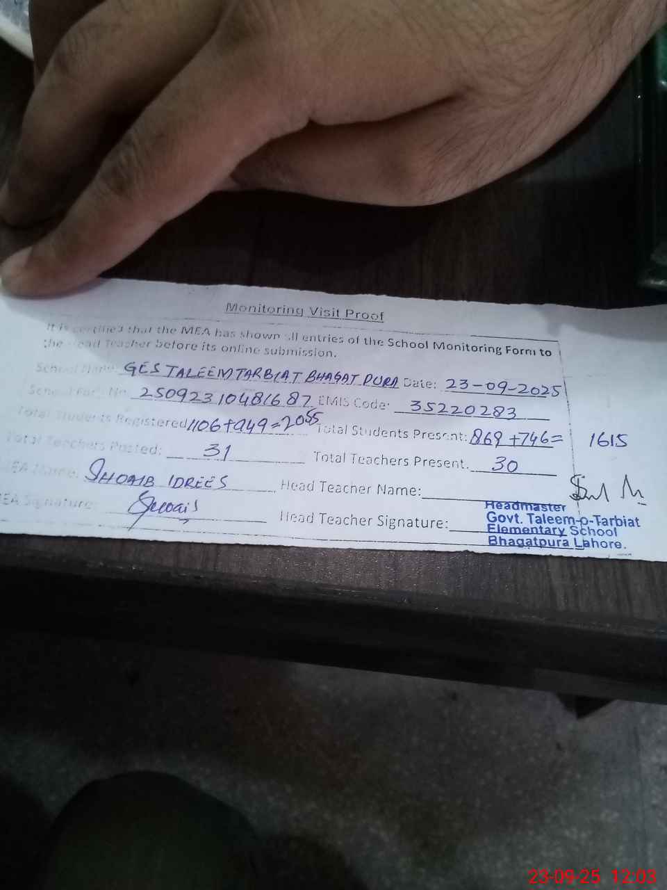 | Remarks (Use Separate Page if Required): 1 NSB and FTF record register not maintained since April 2025 2 School councils meeting not conducted in the month of Aug 2025 3 Hafiz Muhammad Ikram SG shown on stop gap duty but written order not present so as per SOP marked him absent 4 This school comprises of two separate campus away from 1 KM the main camp serve from class ECE to class six and secondary camp server class 7 and 8 5 maximum soaps are missing at students hand washing points 6 Grass cutting was not carried out properly | |||||