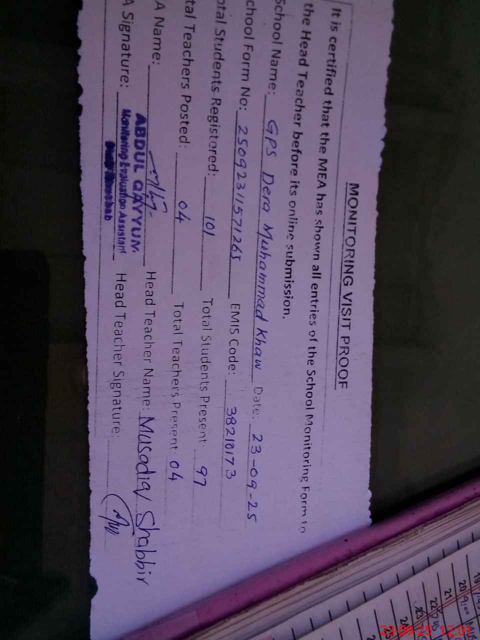 | Attendance Register | Head Teacher | MEA with School | Visit Proof |