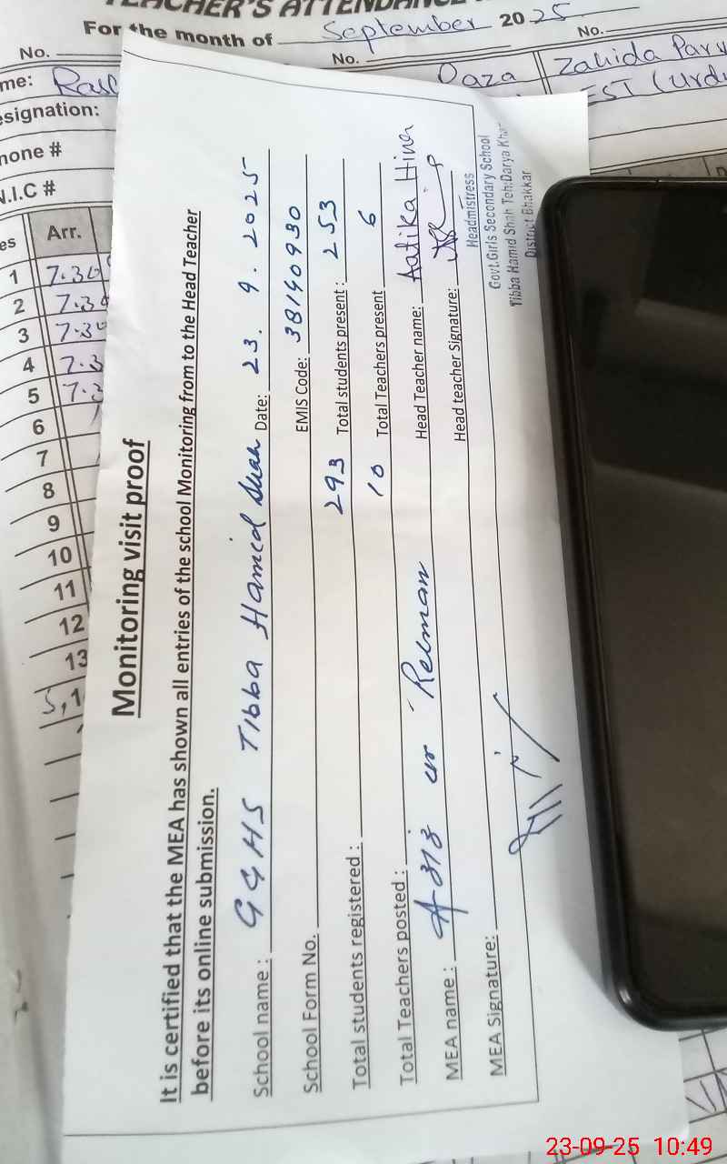 | Attendance Register | Head Teacher | MEA with School | Visit Proof |