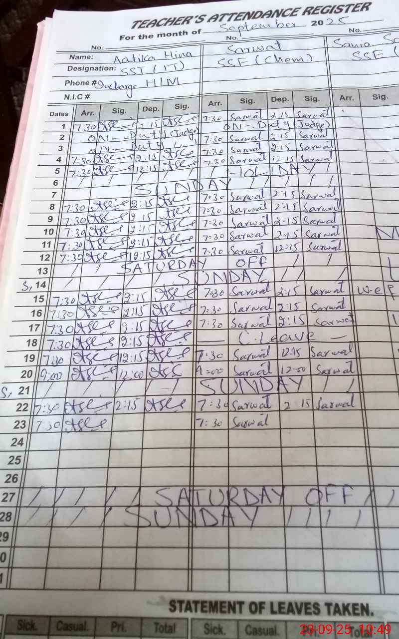 | CNIC | Full Name | Designation | R/C | Absence During Last Calender Month |