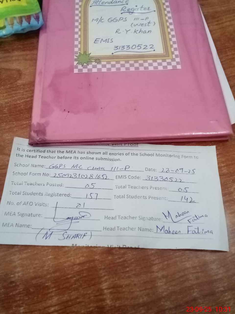 | Attendance Register | Head Teacher | MEA with School | Visit Proof |