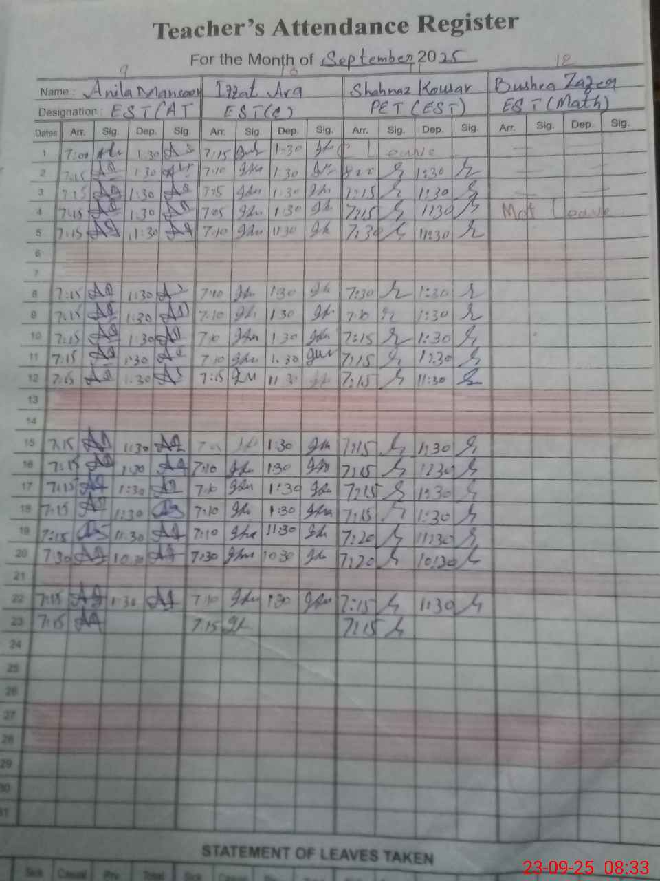 | Attendance Register | Head Teacher | MEA with School | Visit Proof |