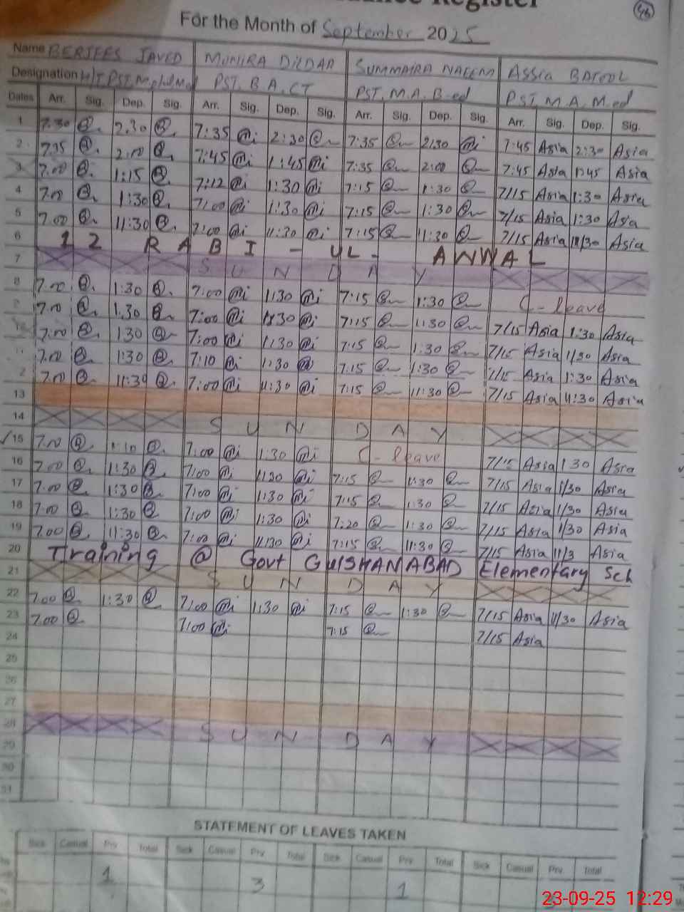 | CNIC | Full Name | Designation | R/C | Absence During Last Calender Month |