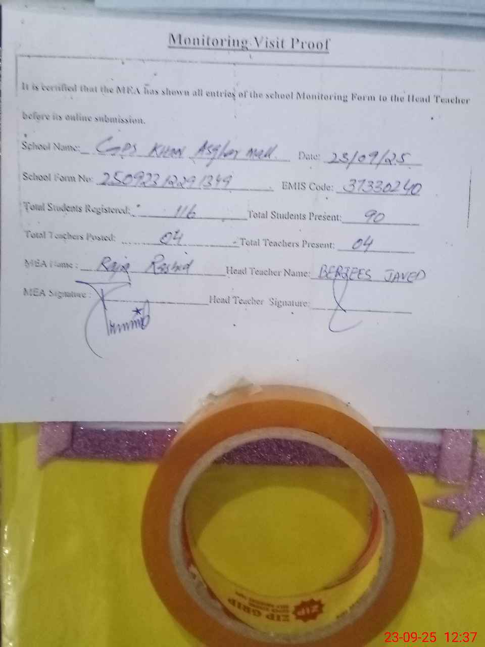 | Attendance Register | Head Teacher | MEA with School | Visit Proof |