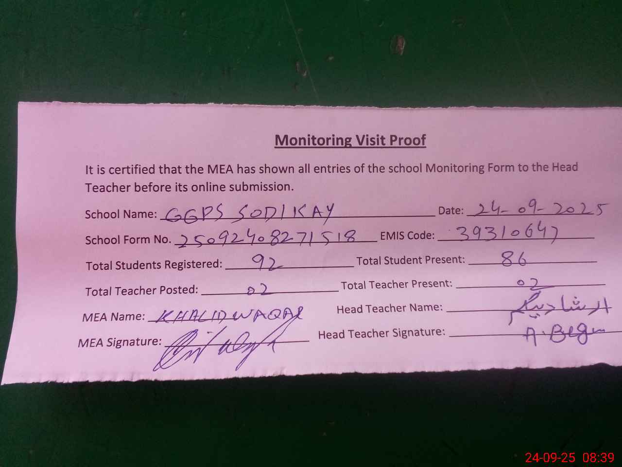 | Certified that this School was Inspected by the Undersigned MEA/DMO Today and the Information Stated Above is as Per Record. | |||||