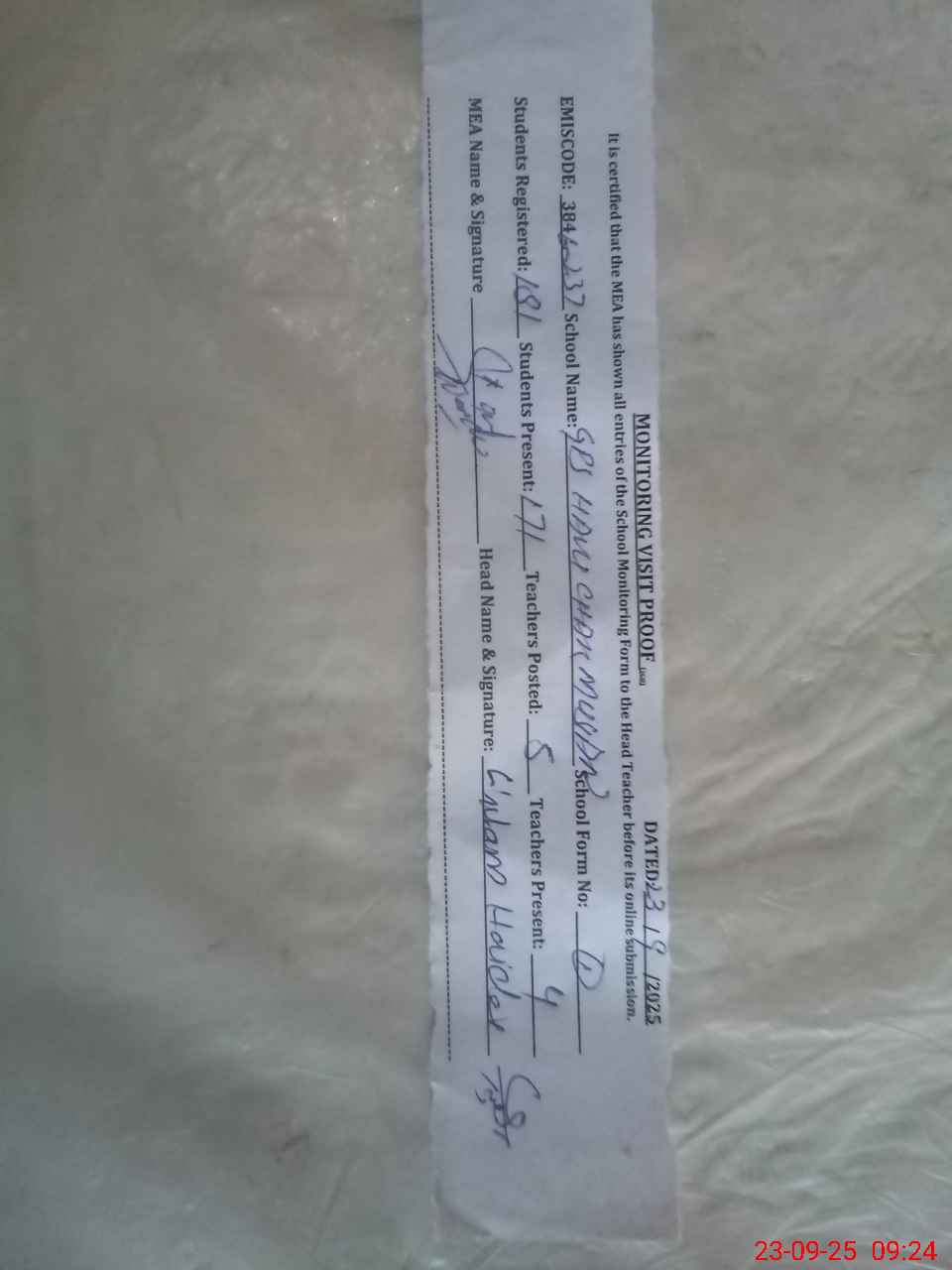 | Attendance Register | Head Teacher | MEA with School | Visit Proof |