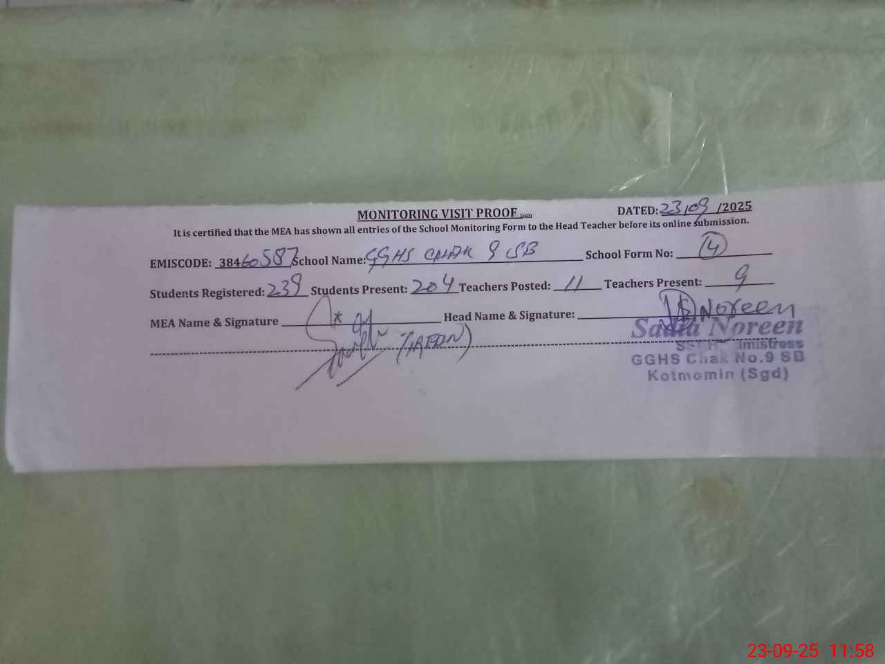 | EMIS Code: 38460587 | Name of School: GGHS CHAK NO.9 SB | |||