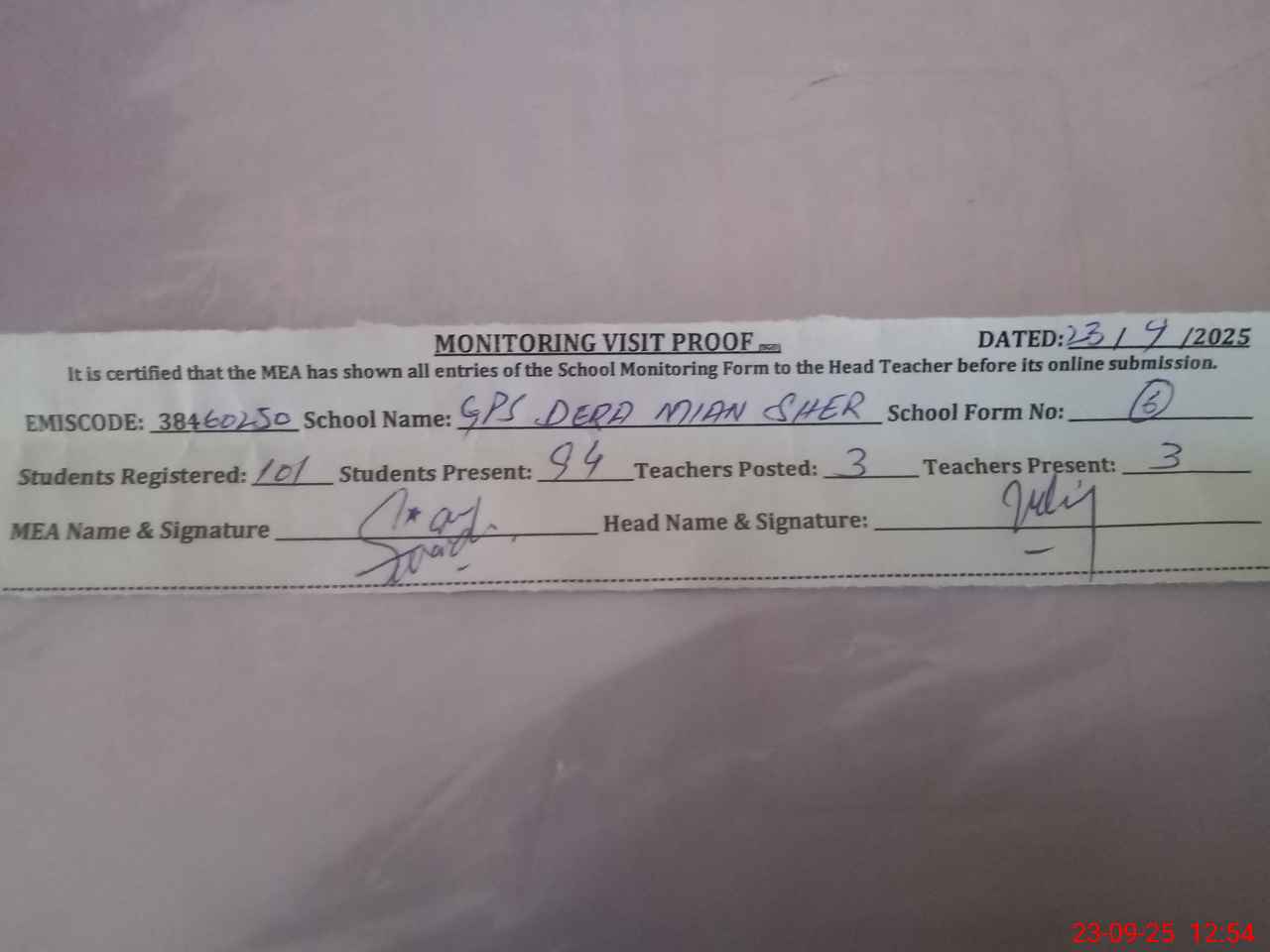 | Attendance Register | Head Teacher | MEA with School | Visit Proof |