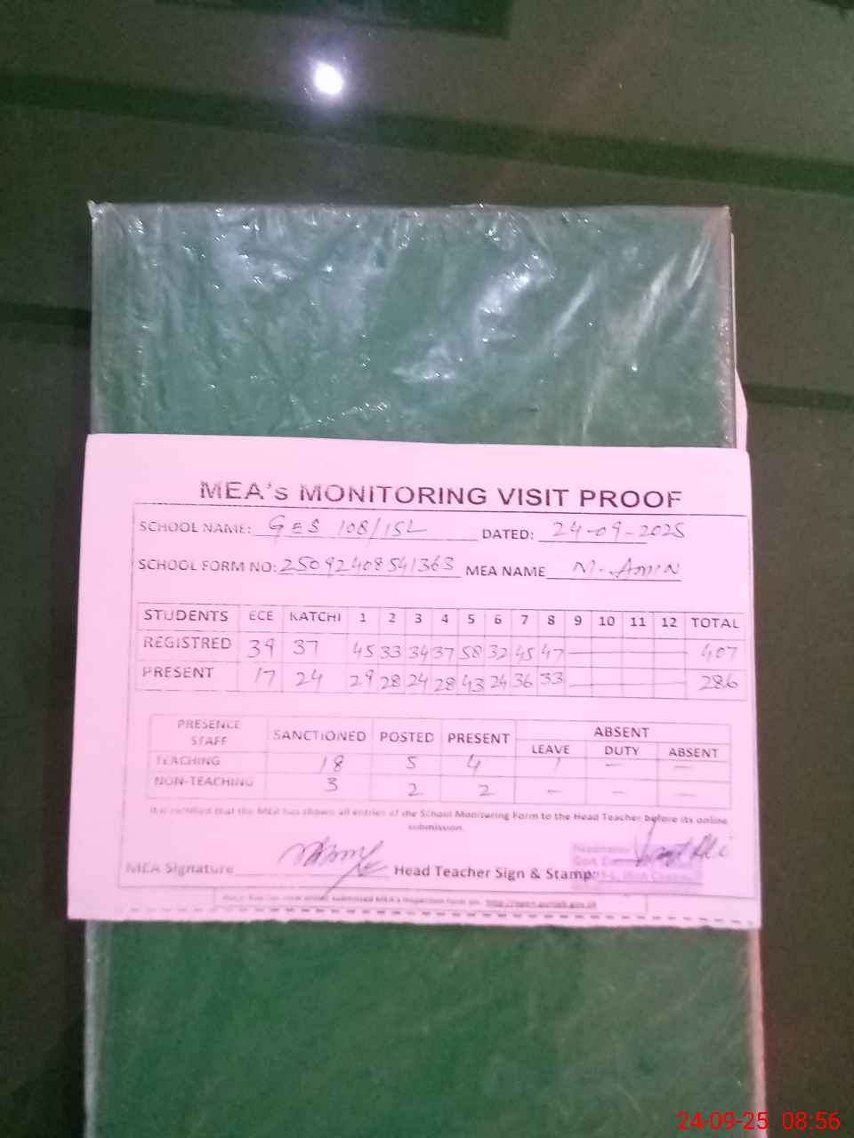 | Attendance Register | Head Teacher | MEA with School | Visit Proof |