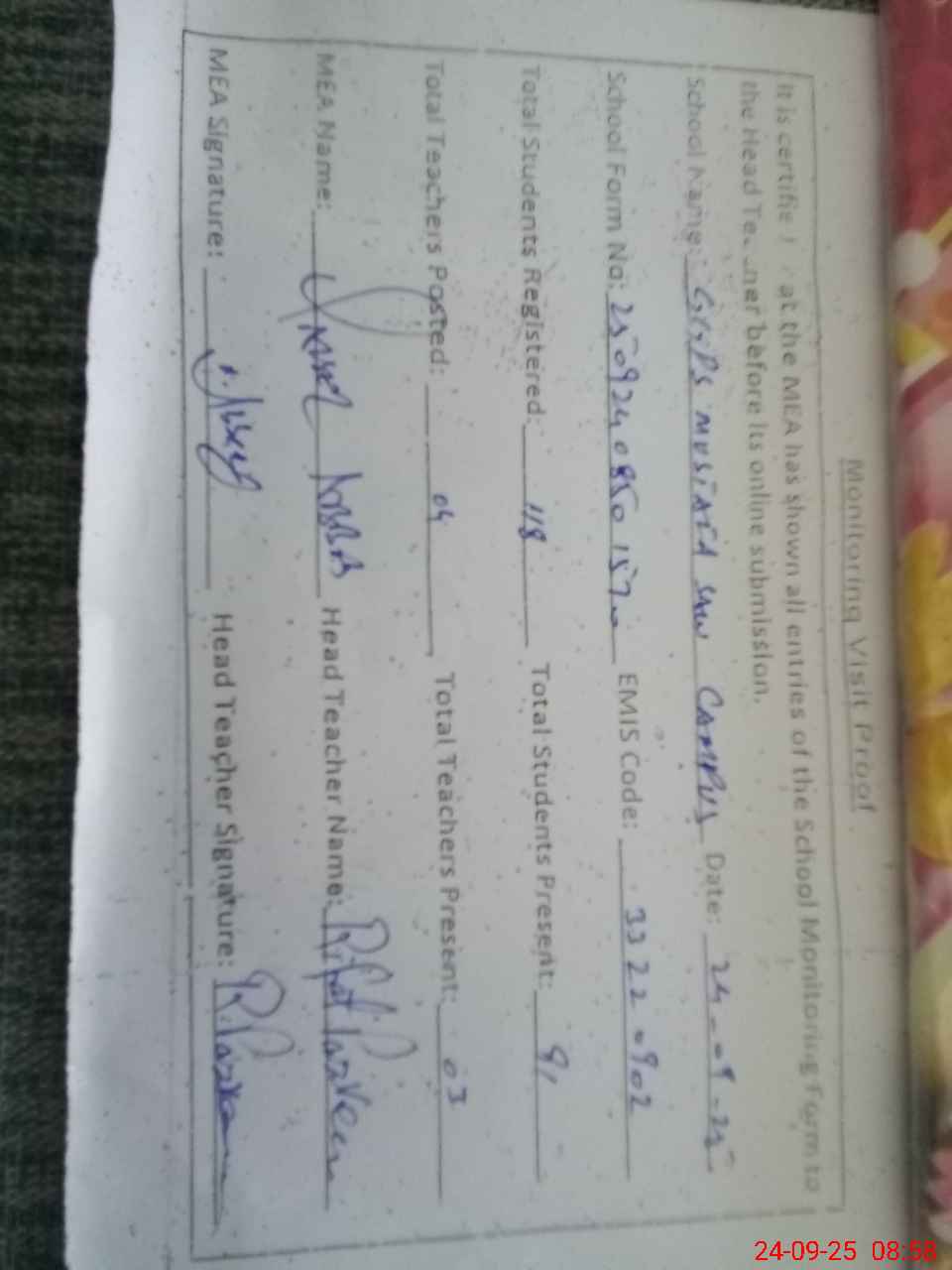 | Name: IS**** ZA**** Designation: (School Headmaster's/Headmistress's) PST/PTC/JV Phone/Cell Number: 03**** |