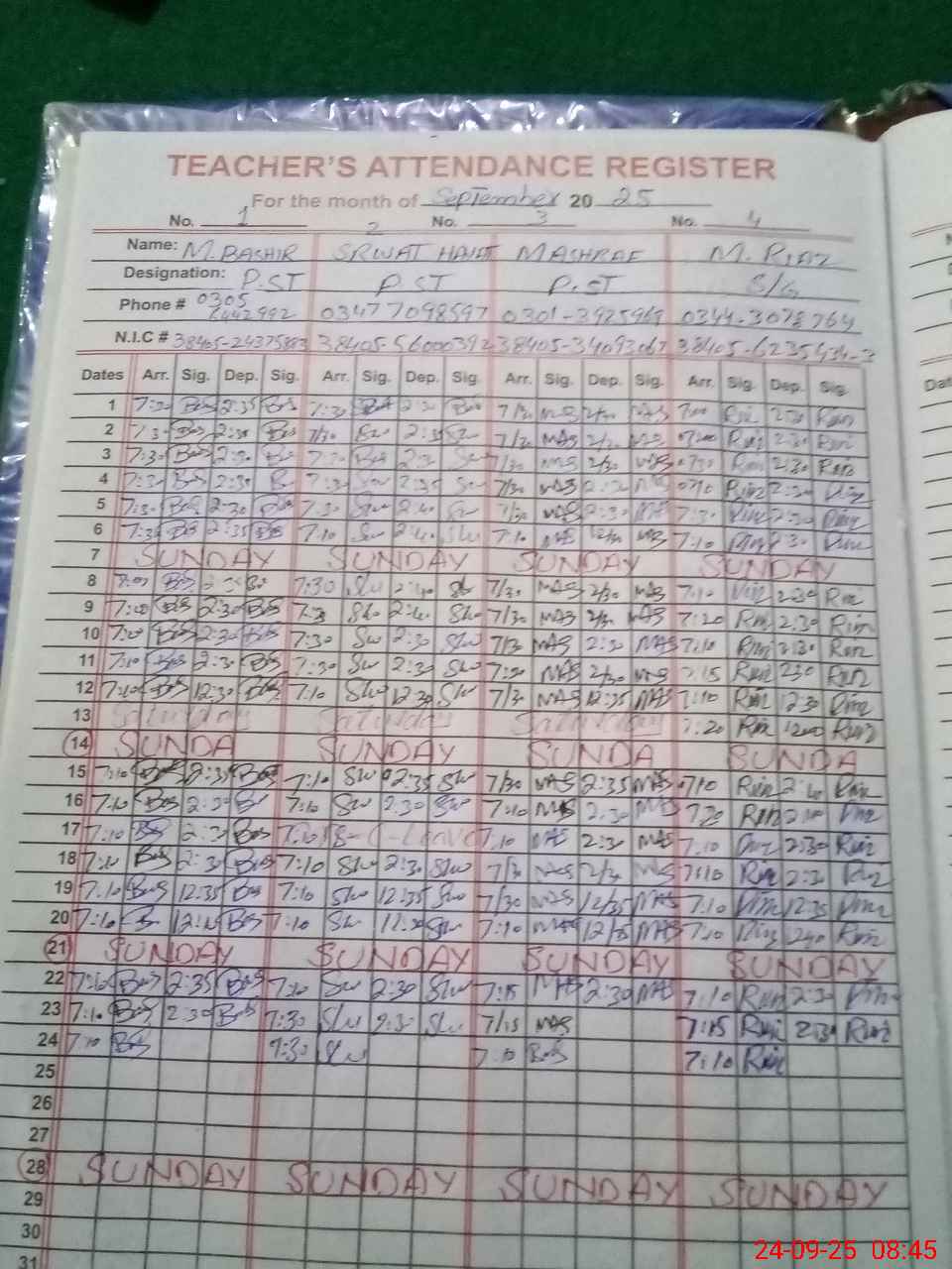 | CNIC | Full Name | Designation | R/C | Absence during last cal. month |
