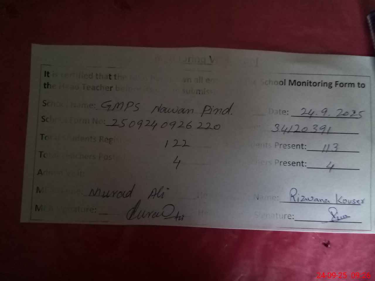 | Attendance Register | Head Teacher | MEA with School | Visit Proof |