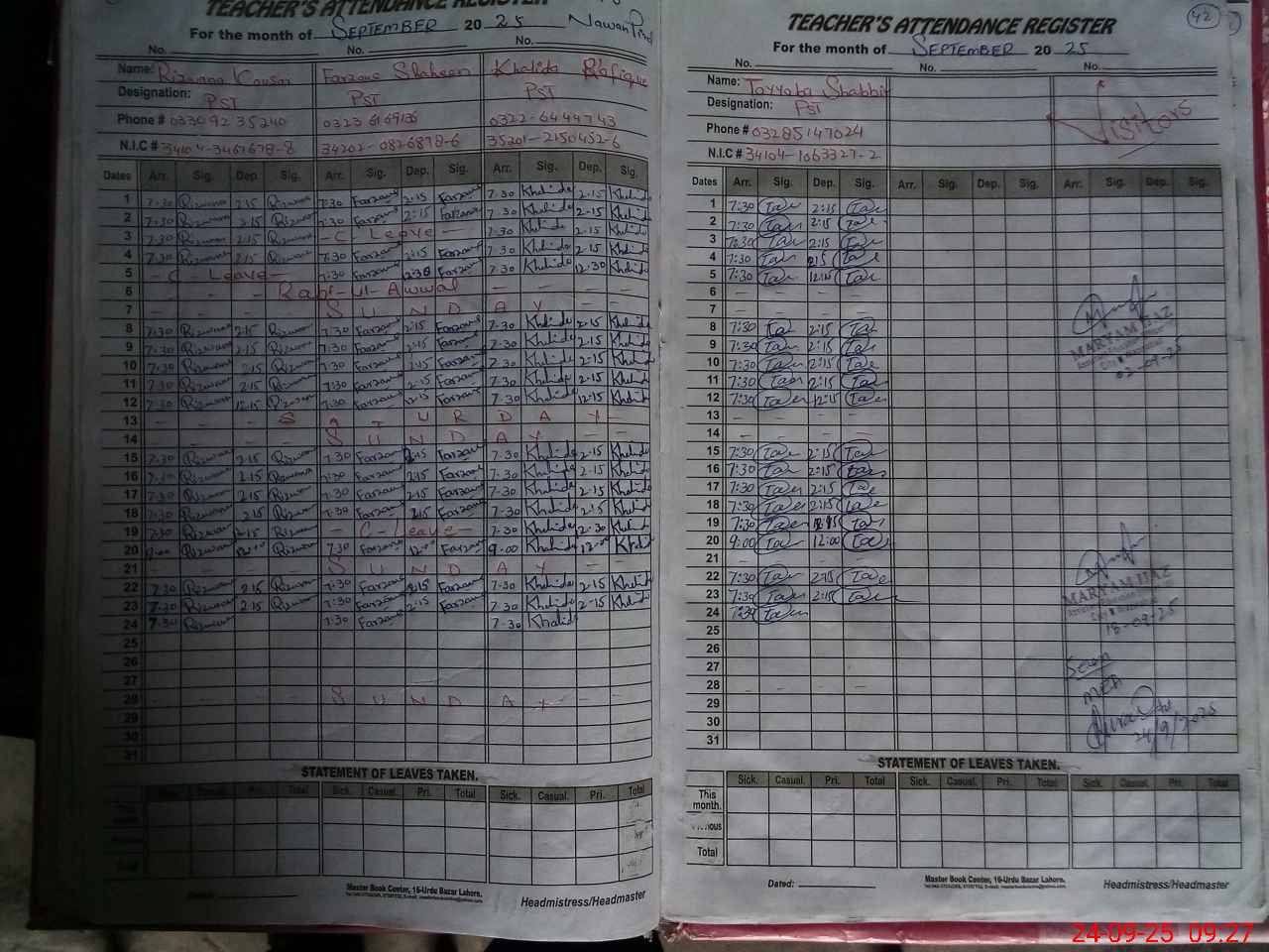 | CNIC | Full Name | Designation | R/C | Absence During Last Calender Month |