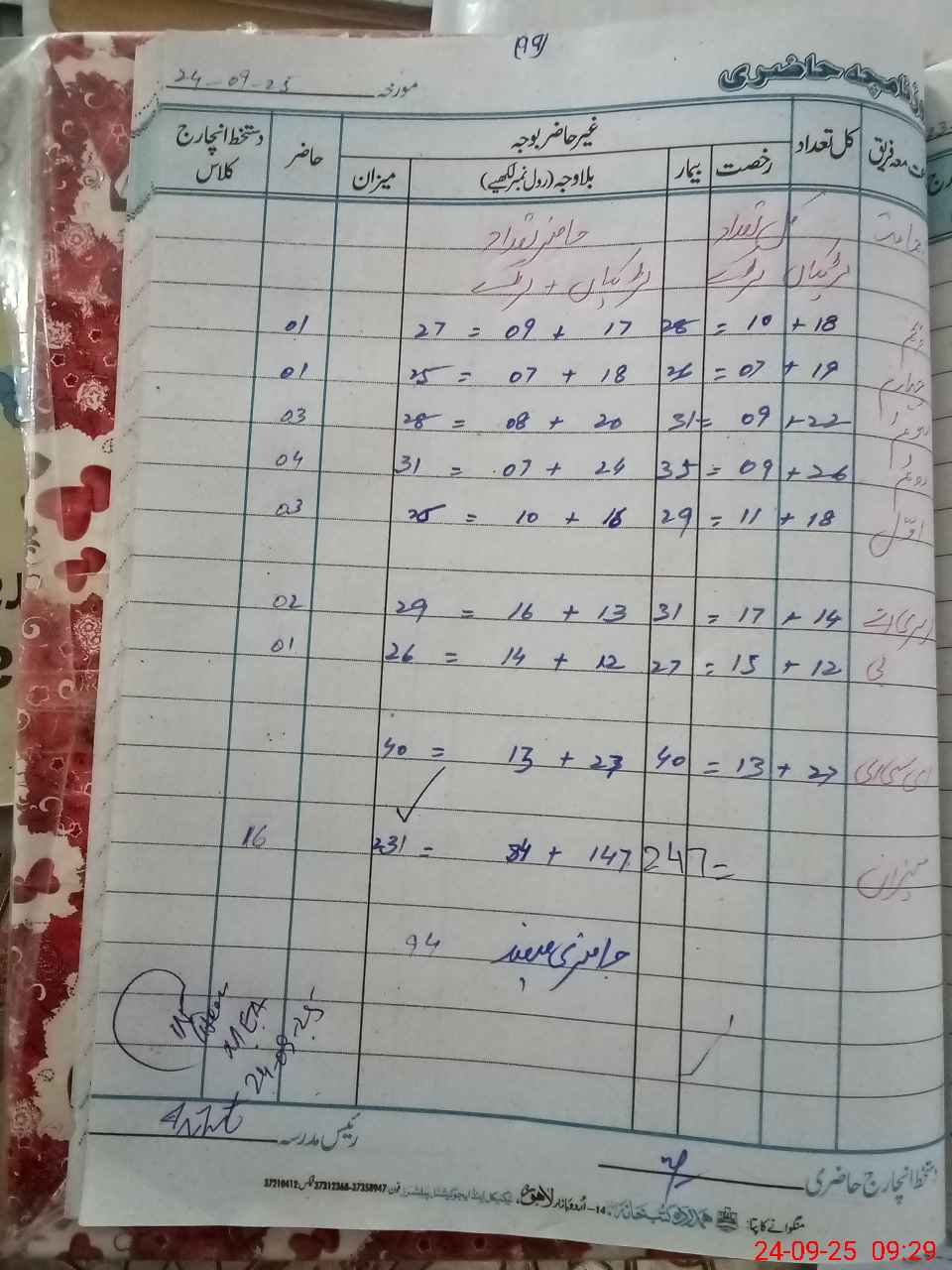 | Total Students Present | 40 | 0 | 55 | 26 | 31 | 28 | 25 | 26 | 231 | |||||||