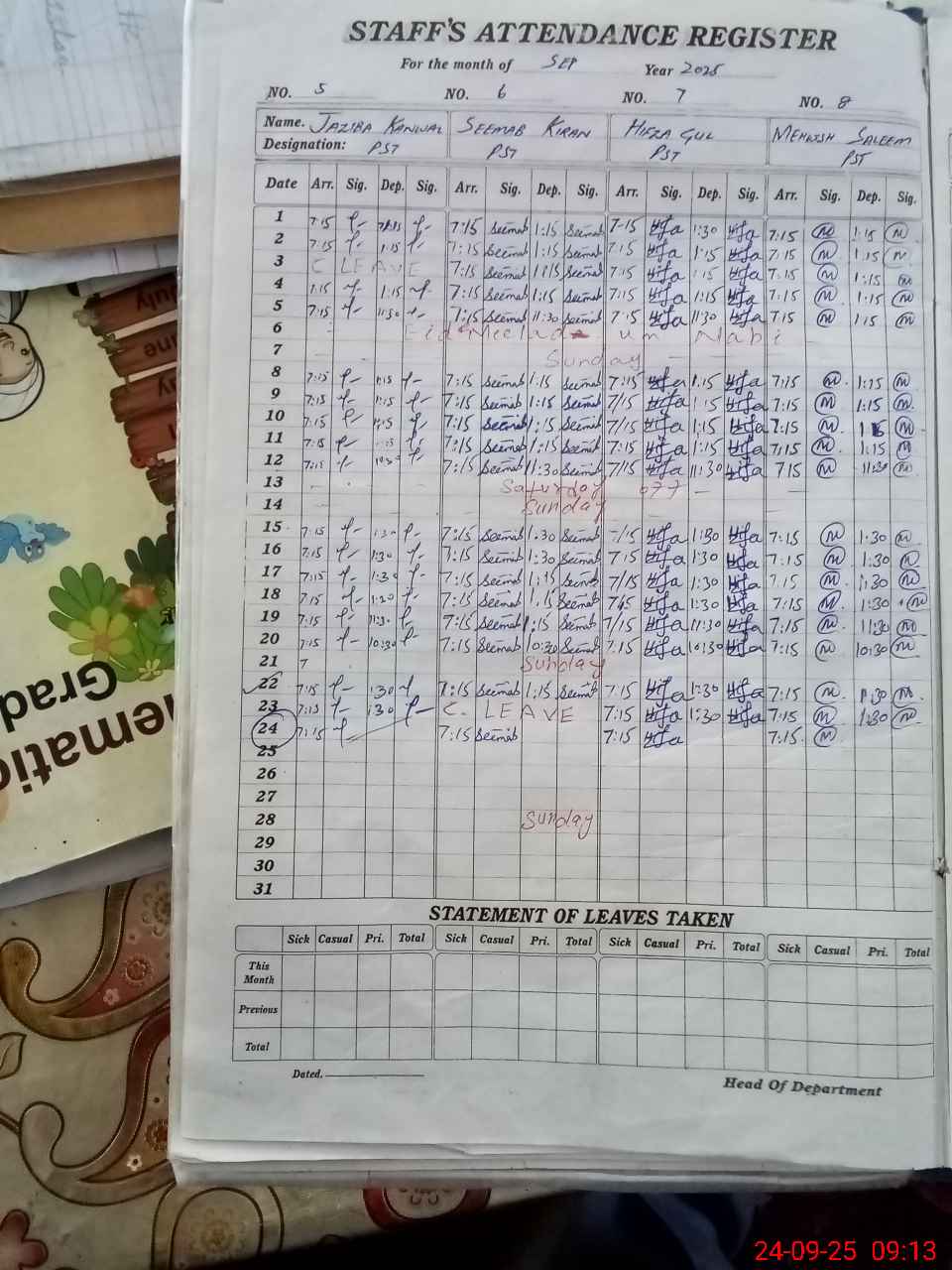 | Attendance Register | Head Teacher | MEA with School | Visit Proof |