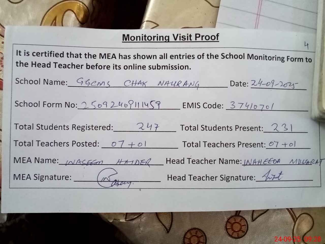 | EMIS Code: 37410701 | Name of School: GGCMS CHAK NAURAG | |||