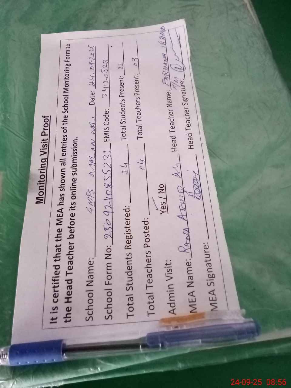 | Attendance Register | Head Teacher | MEA with School | Visit Proof |