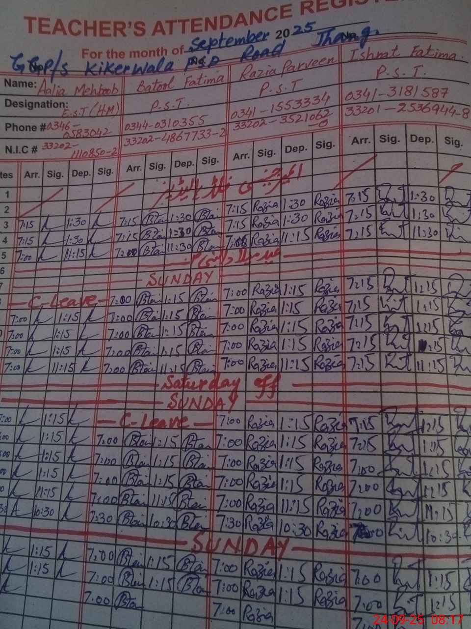 | CNIC | Full Name | Designation | R/C | Absence During Last Calender Month |