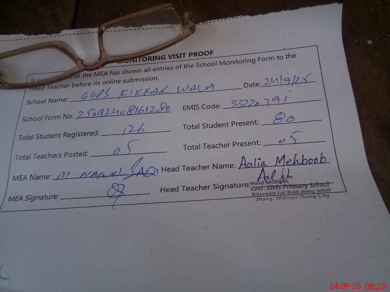 | Attendance Register | Head Teacher | MEA with School | Visit Proof |