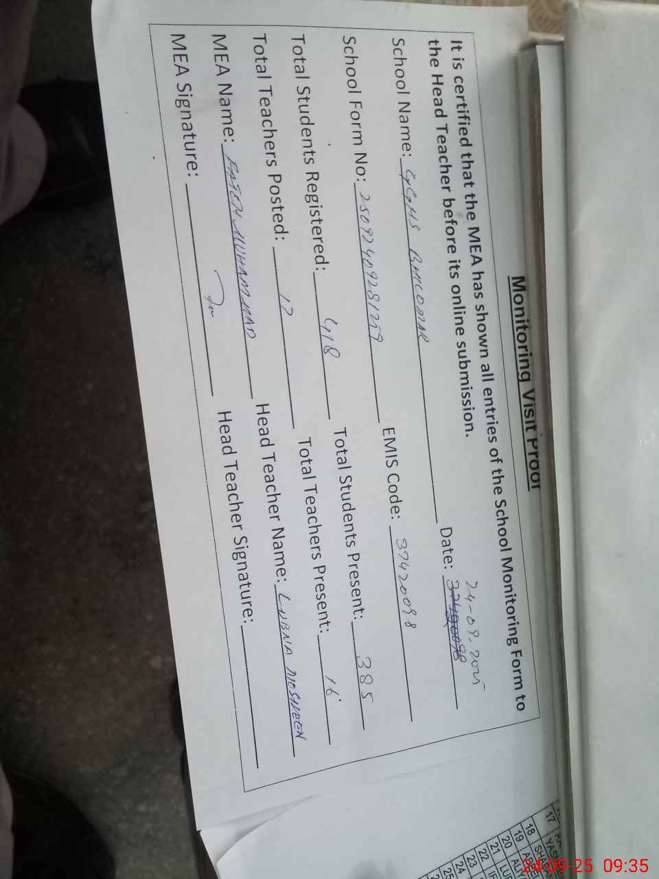 | Attendance Register | Head Teacher | MEA with School | Visit Proof |