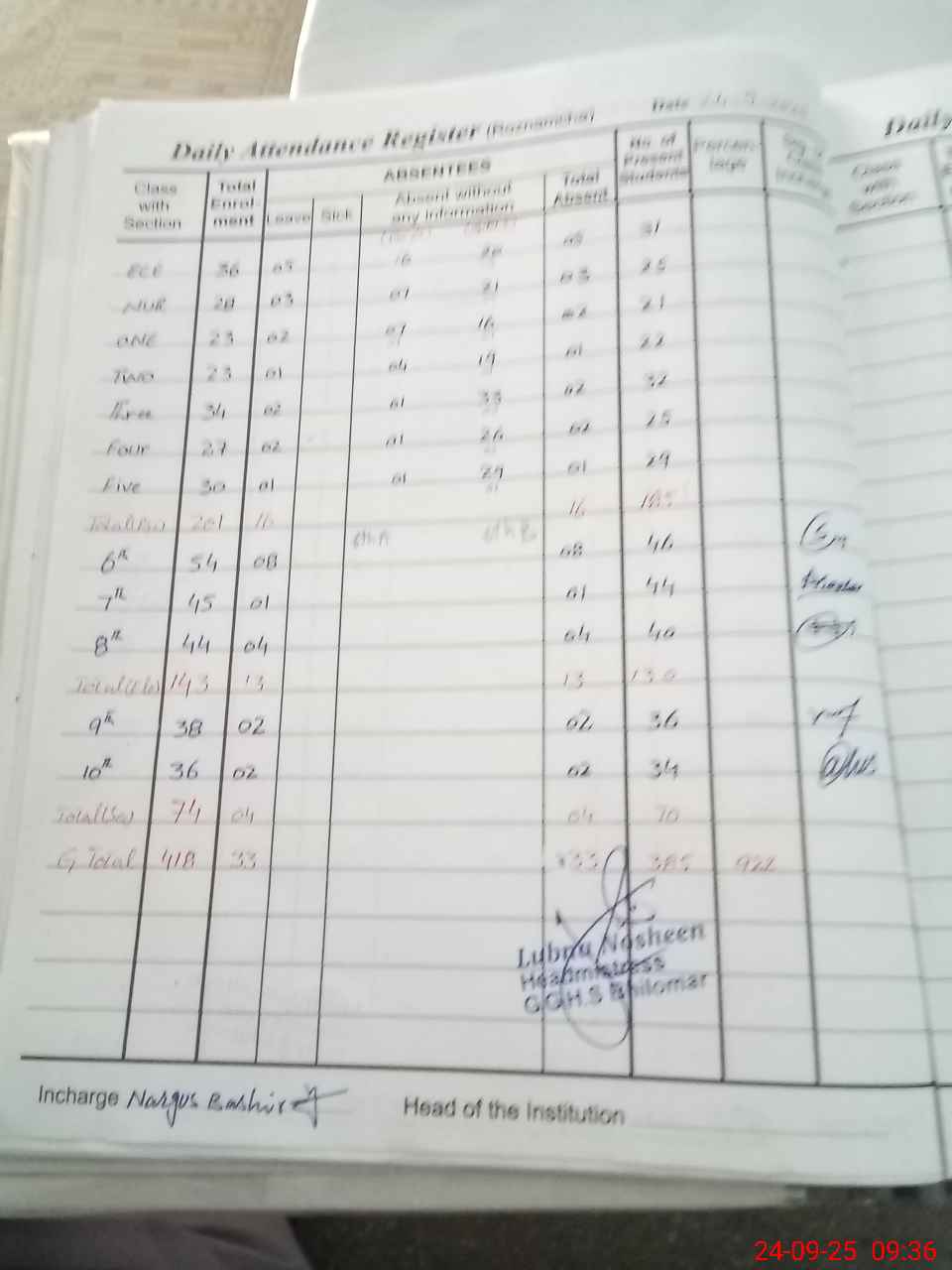 | No. of Students Present - Female | 15 | 0 | 18 | 15 | 18 | 31 | 24 | 28 | 46 | 44 | 40 | 36 | 34 | 349 | ||