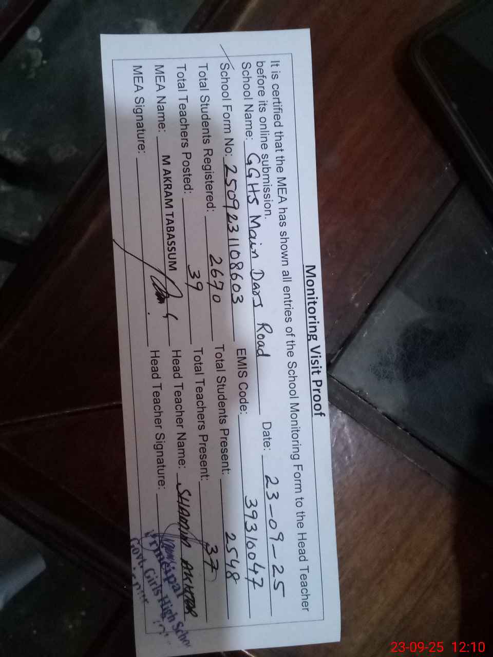 | Attendance Register | Head Teacher | MEA with School | Visit Proof |