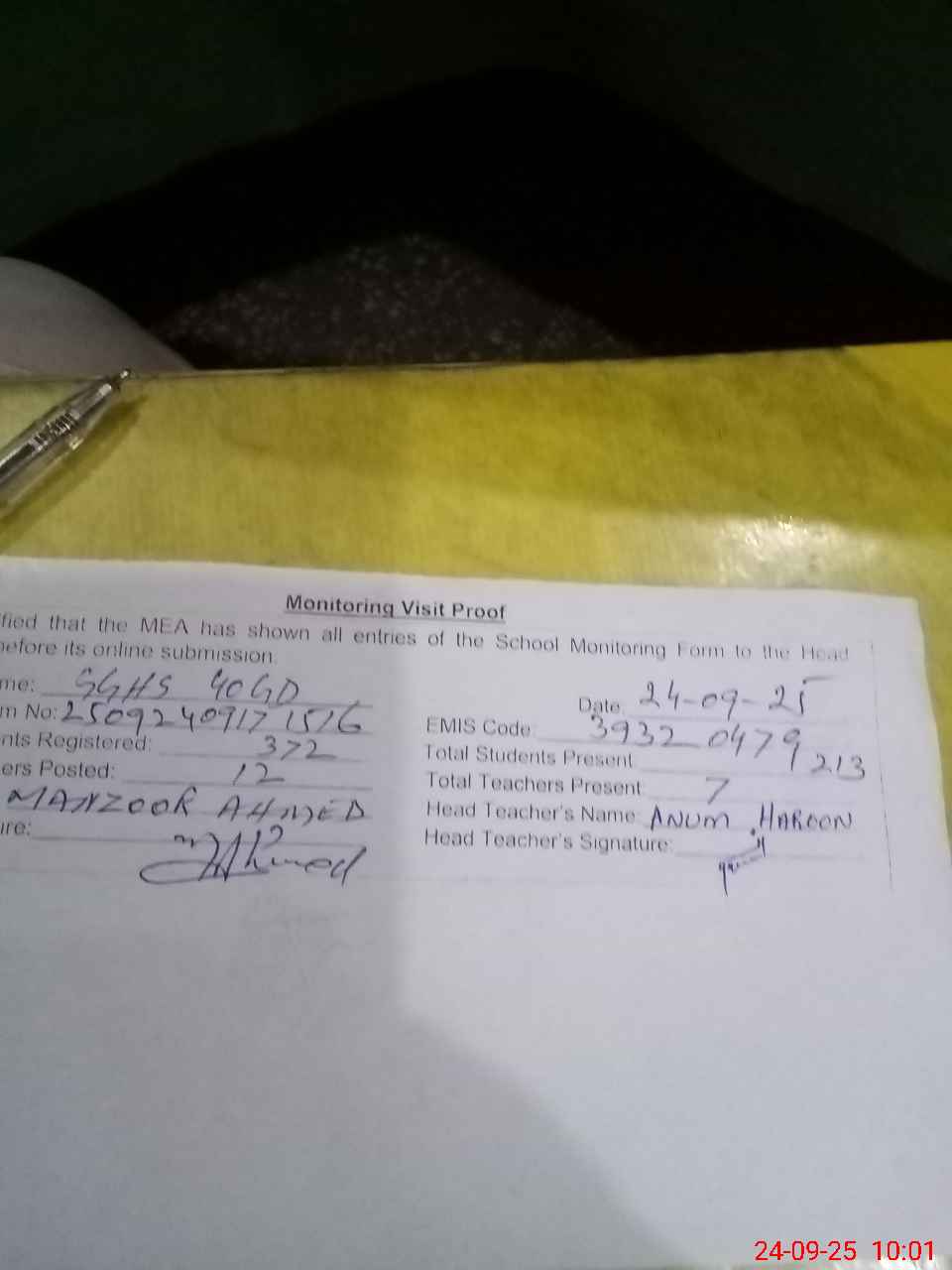 | Attendance Register | Head Teacher | MEA with School | Visit Proof |