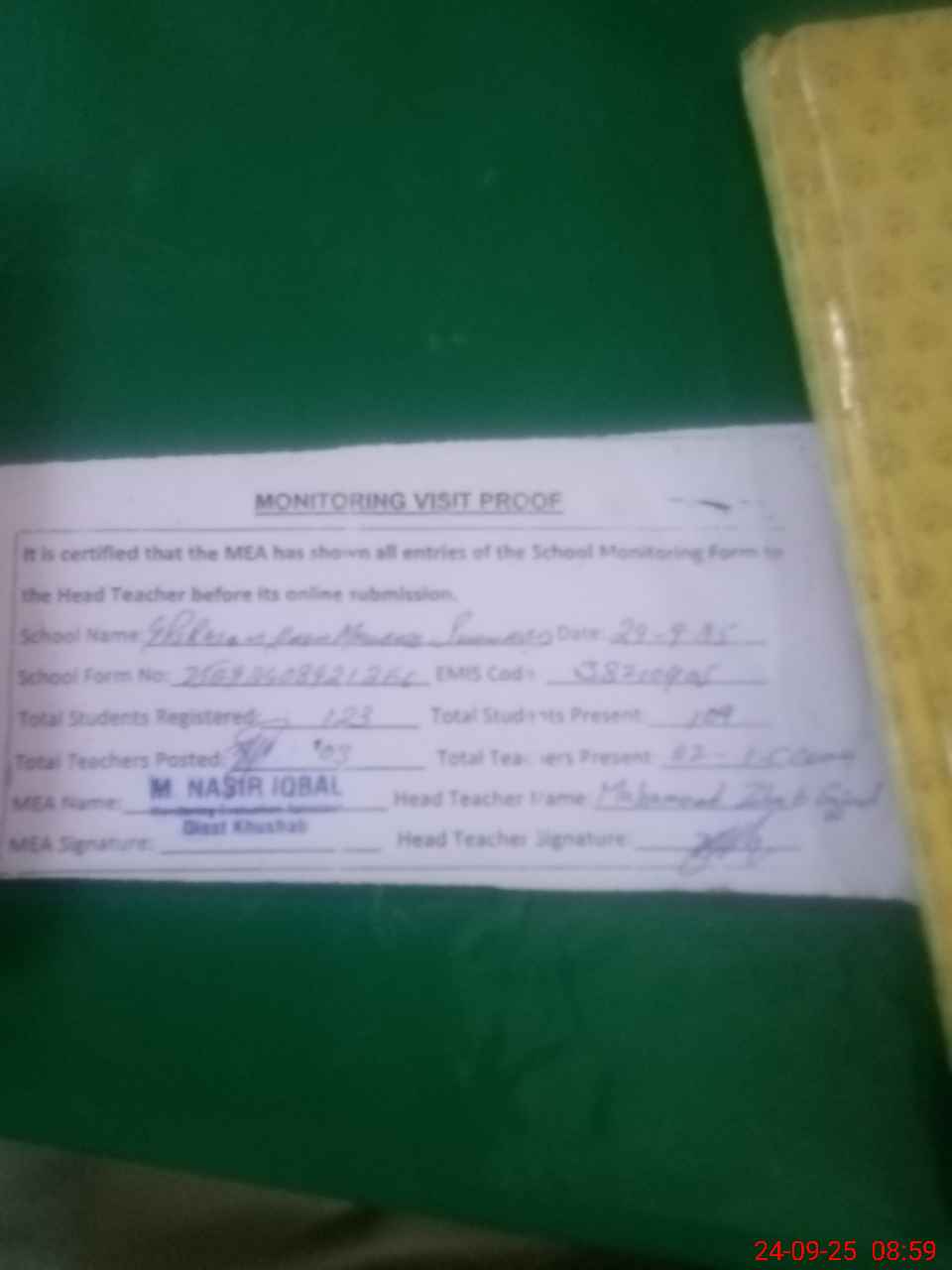 | Attendance Register | Head Teacher | MEA with School | Visit Proof |
