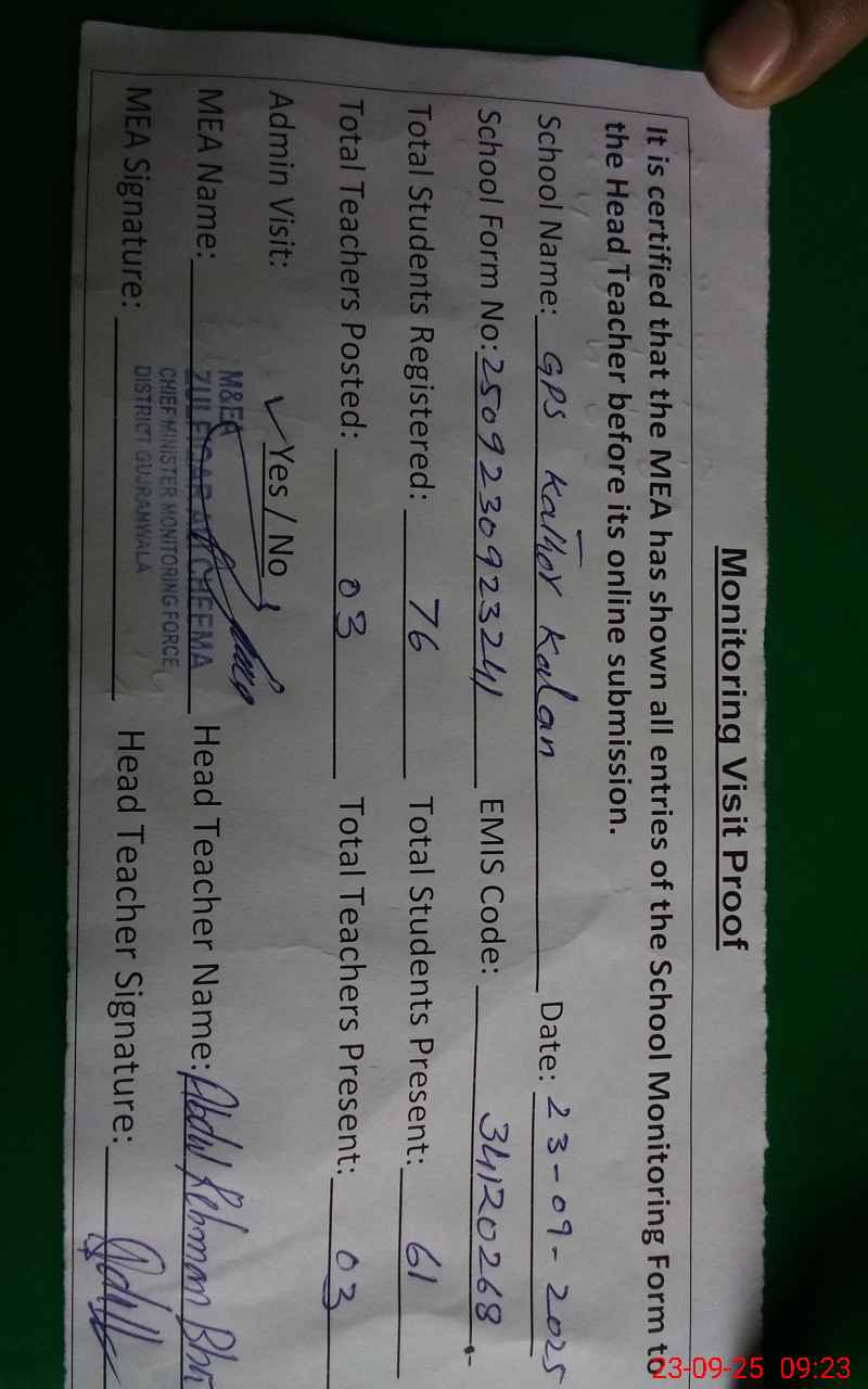 | Attendance Register | Head Teacher | MEA with School | Visit Proof |