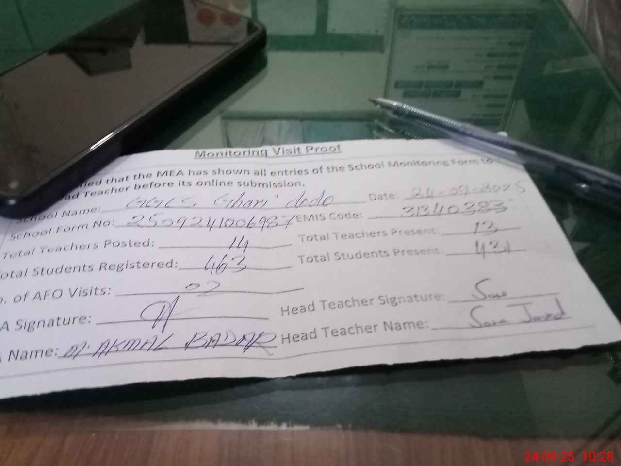 | Attendance Register | Head Teacher | MEA with School | Visit Proof |