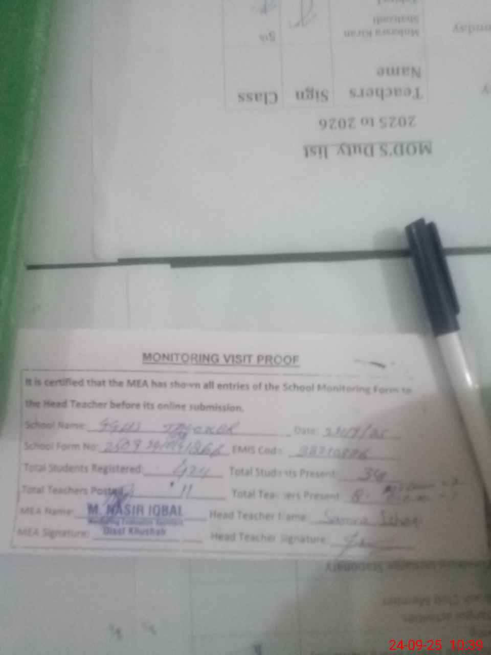 | Attendance Register | Head Teacher | MEA with School | Visit Proof |
