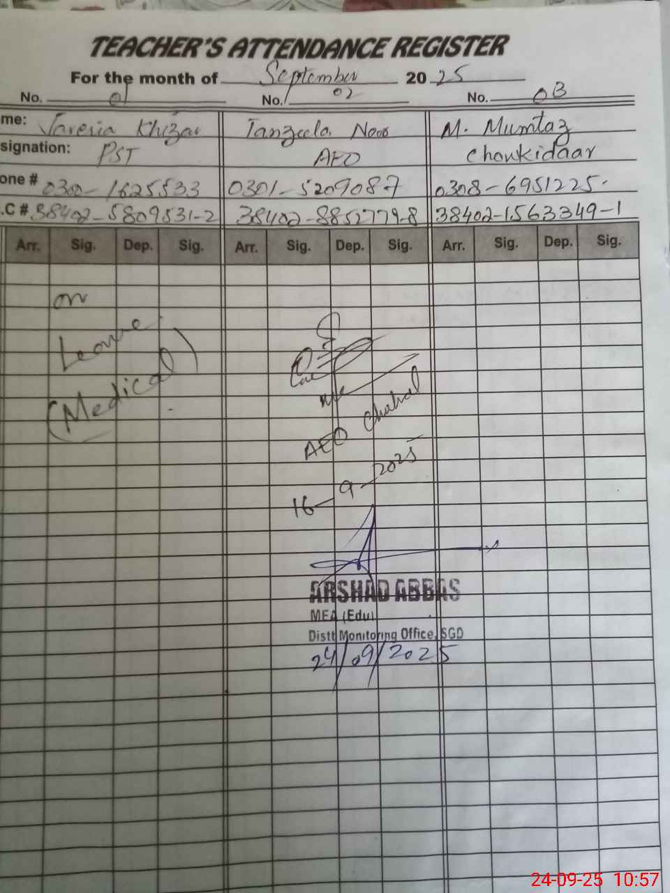 | CNIC | Full Name | Designation | R/C | Absence during last cal. month |