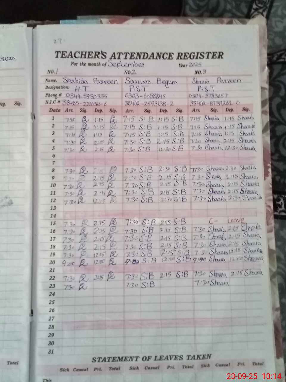 | CNIC | Full Name | Designation | R/C | Absence During Last Calender Month |