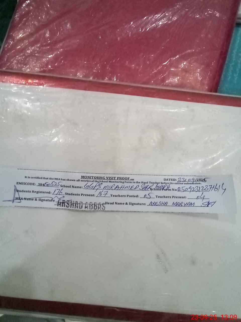 | Attendance Register | Head Teacher | MEA with School | Visit Proof |
