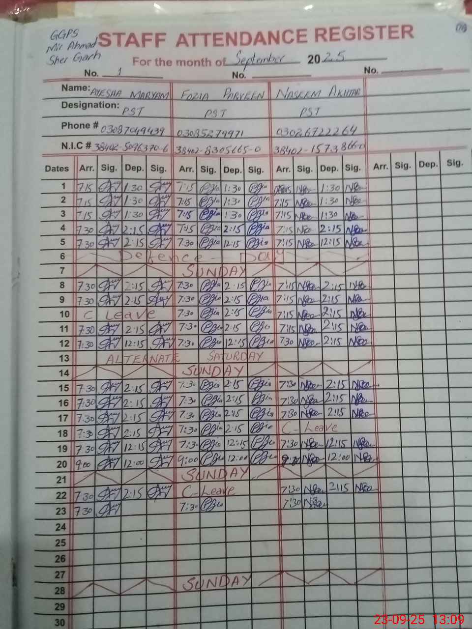 | CNIC | Full Name | Designation | R/C | Absence during last cal. month |